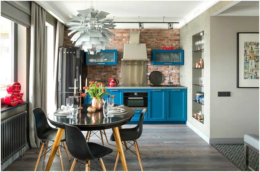 Лофт – в этом интерьерном направлении синий применяется в качестве дополнительного. Синий отлично выглядит на фоне кирпичных либо серых штукатуренных стен. В стильной кухне лофт уместны будут синие гарнитур и обеденная группа.