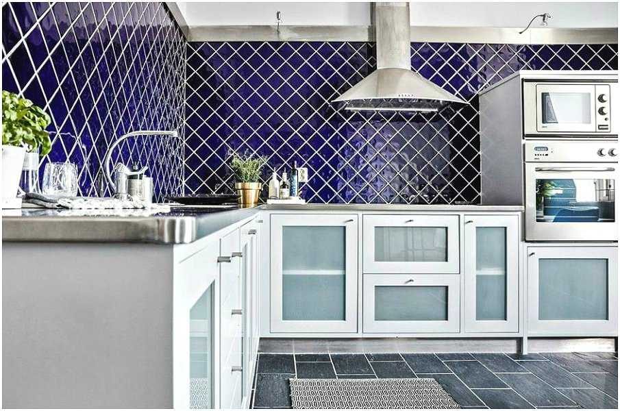 Светлый гарнитур оттеняет глянцевую плитку ультрамаринового оттенка