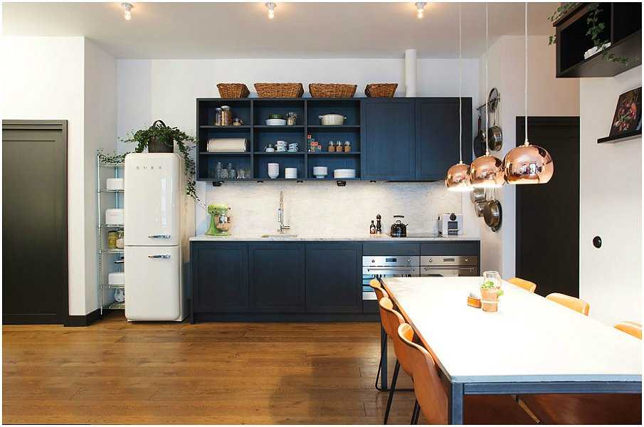 Обыграть синий цвет в интерьере кухни можно с помощью акцентных металлических деталей, фурнитуры и бытовой техники. Металл подбирается исходя из стилистических особенностей дизайна. Для современных стилей, таких как индастриал, лофт, хай-тек, минимализм, характерно использование хромированных элементов, в то время как в классических, винтажных или скандинавских интерьерах будут уместны медные, латунные и бронзовые акценты.