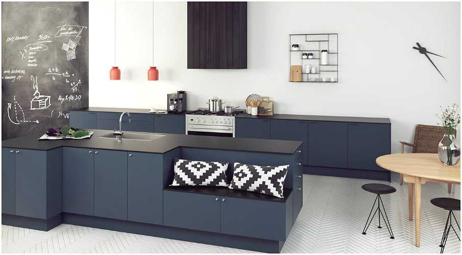 Использование в интерьере чёрно-синей цветовой гаммы также не совсем оправданный приём. Это сочетание слишком мрачное, которое вряд ли принесёт удовольствие от процесса приёма или приготовления пищи.