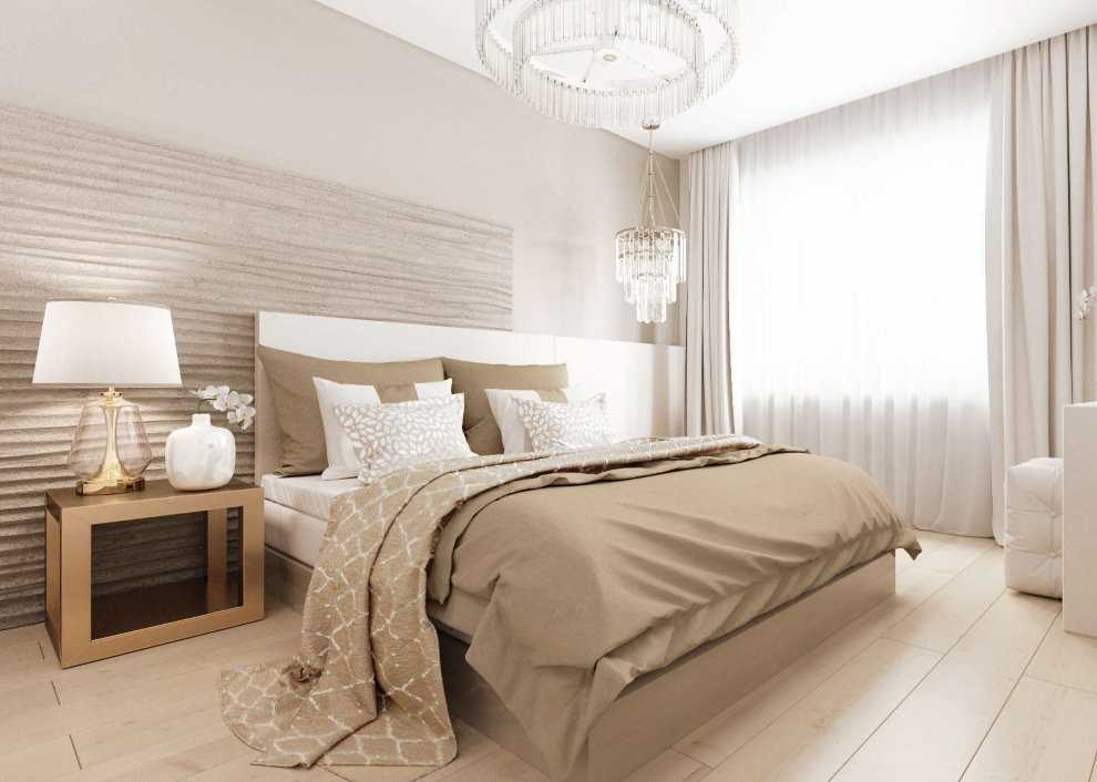 Кстати, оттенки бежевого с добавлением золота не менее прекрасны в спальне. С их помощью вы сможете придать помещению нежность, изящество
