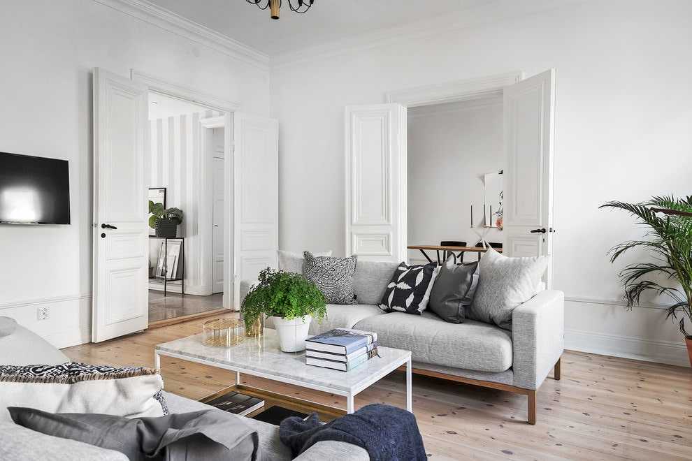 Светлые деревянные двери в гостиной с белоснежными стенами