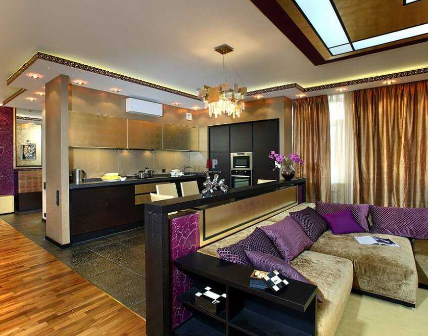 на кухне роль золотого фрагмента может выполнять небольшая люстра, мозаичный фартук, ручки шкафчиков. Такие элементы будут уместны в любом стиле.