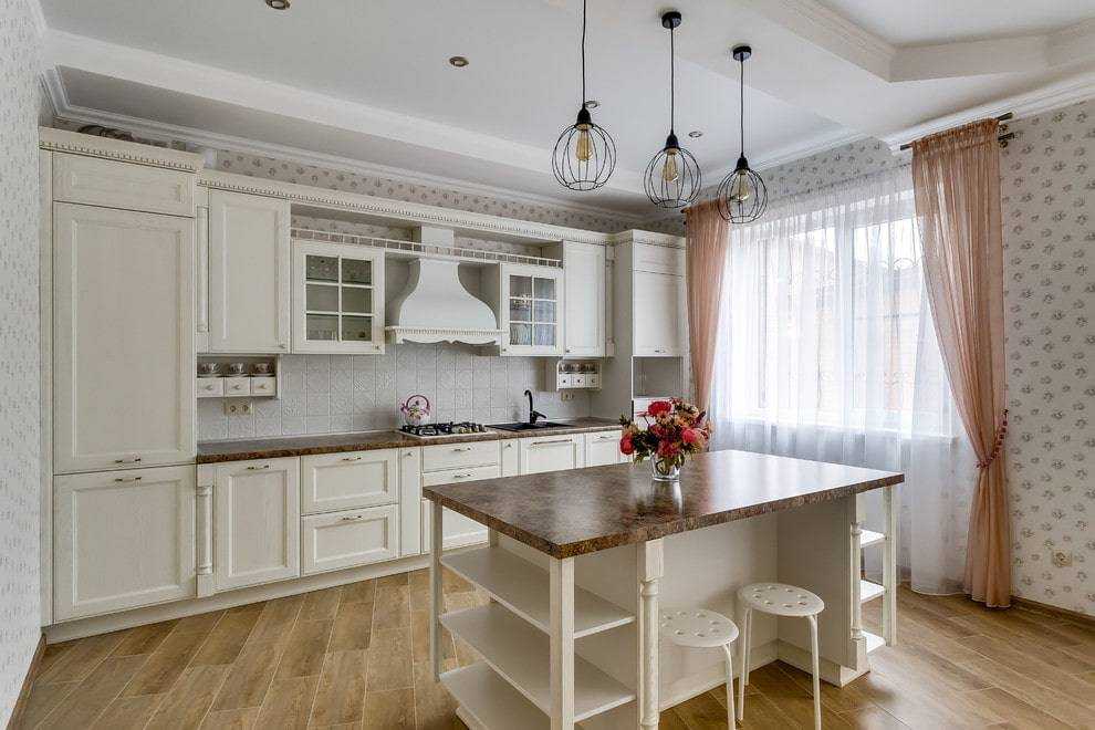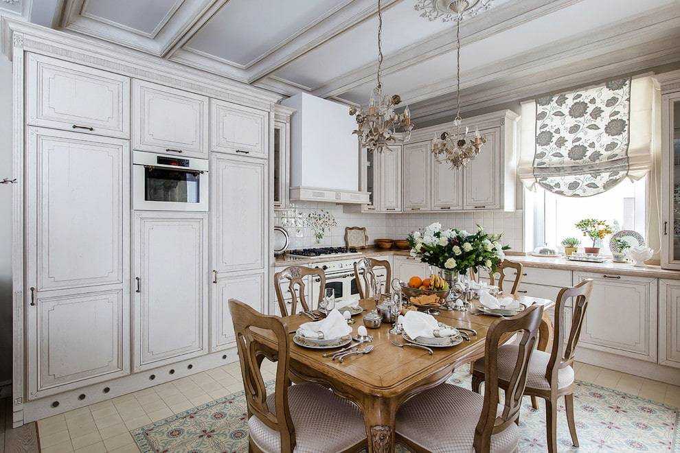 Белая кухня должна быть исключительно матовой со стеклянными дверцами, резьбой, завитками, позолоченной, черной или серебряной фурнитурой. Деревянная столешница должна быть из массива дерева темных пород под цвет ламината или паркета. Из декора подойдут короткие шторы по типу французских или австрийских, римские шторы, ламбрекен, текстиль под обивку, чайный сервиз, круглый обеденный стол.