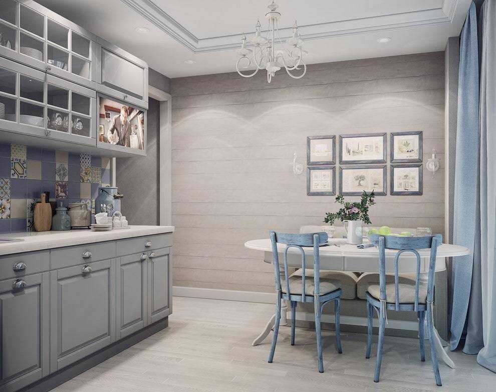 На фото интерьер кухни в стиле прованс в серо-голубых и белых оттенках.