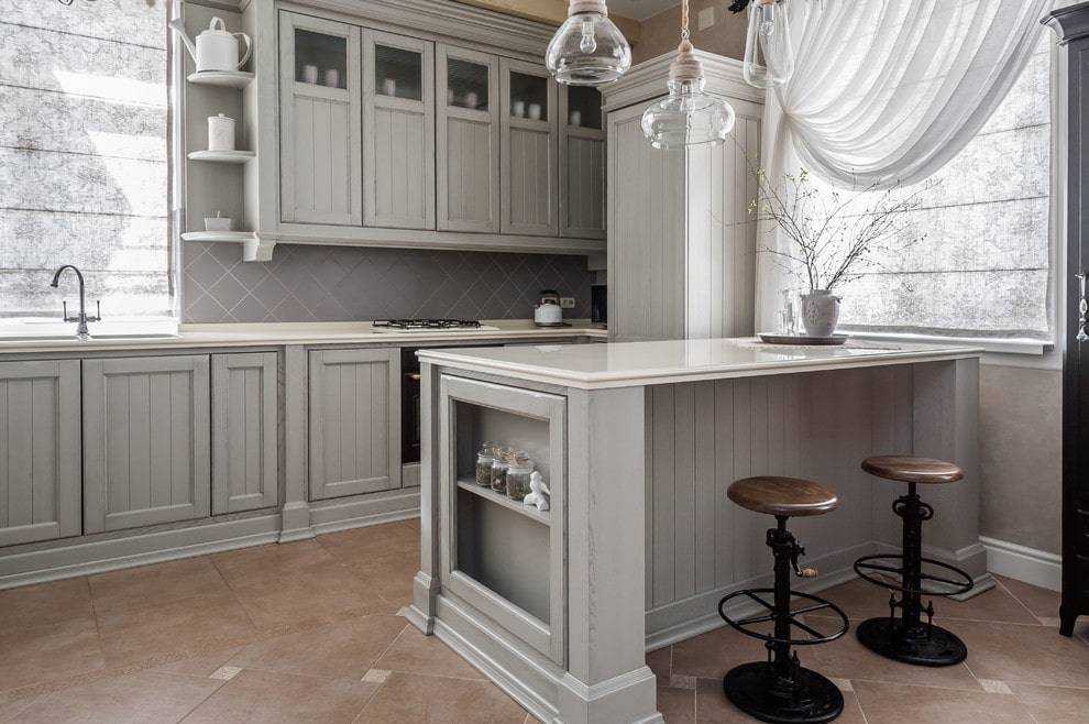 На фото светло-серая столешница на островном столе и основной рабочей зоне, цвет совпадает со стенами и выглядит органично с белым гарнитуром.
