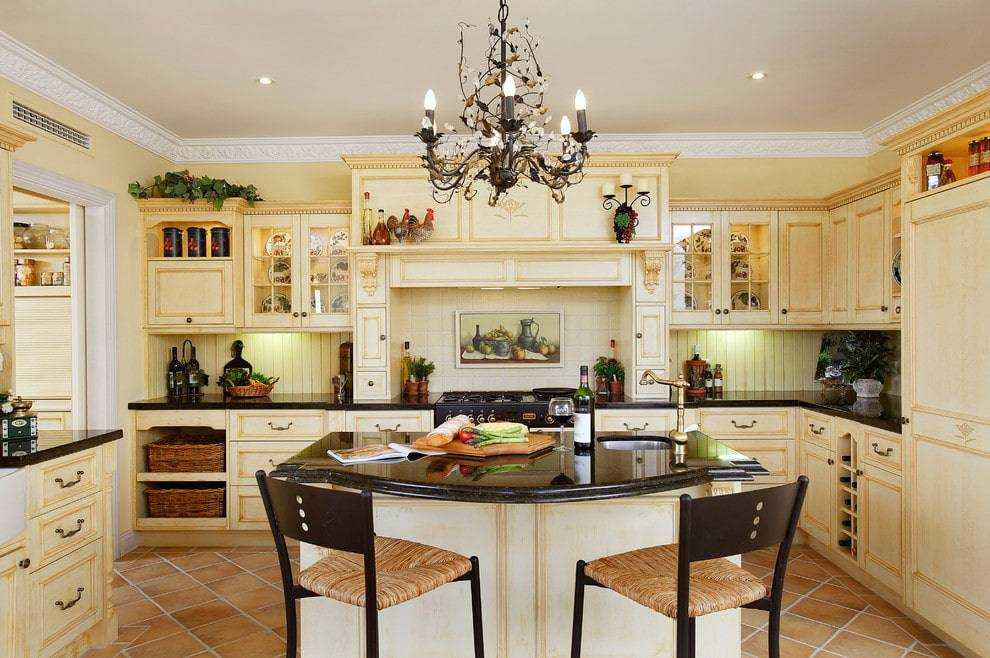 На фото желтый островной гарнитур в интерьере кухни в стиле прованс.