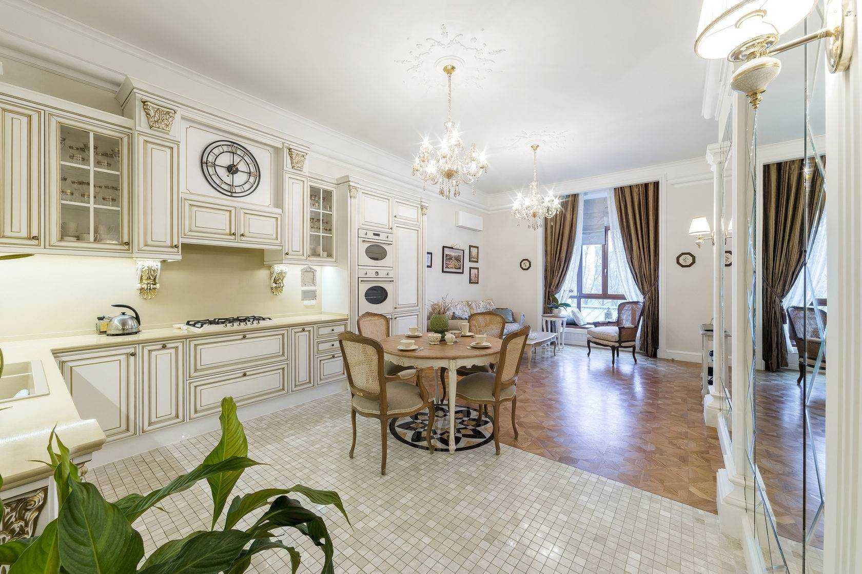 Прекрасным выбором при обустройстве кухонного пространства является сочетание классики и современности. Конечно же, такое объединение стилей довольно смелое. Но если подойти к процессу с полной ответственностью, результат получится блестящим. Для этого достаточно подобрать классическую мебель и придать ей современный внешний вид с помощью текстиля, принтов и орнаментов. В отдельной статье, вы можете почитать подробнее о кухне в стиле современная классика.