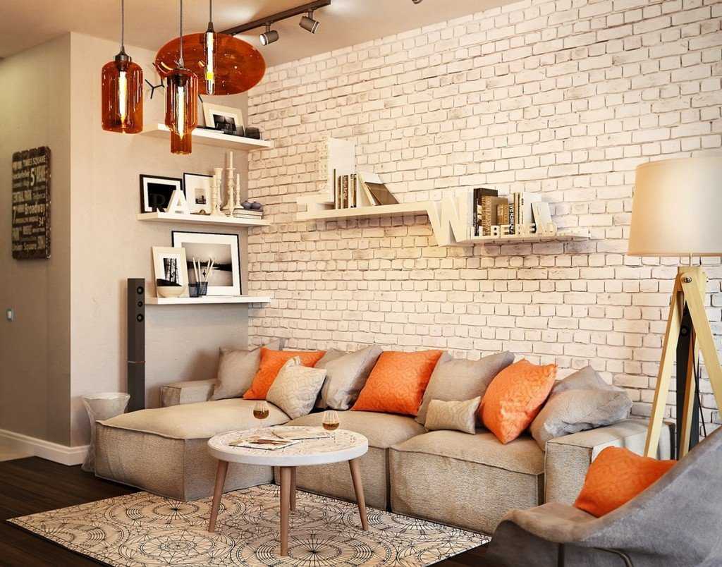 Для этого стоит применять лишь светлые оттенки. Такая отделка поможет визуально расширить помещение, сделать его светлым и привлекательным. Оконные рамы рекомендуется создавать в цвет стен. Они будут с ними сливаться, еще больше расширяя пространство гостиной. А вот элементы кирпичной кладки должны быть в строго ограниченном количестве.