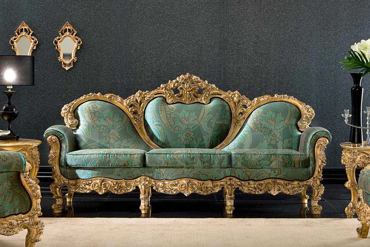 - Барокко – массивная и вычурная софа из деревянного каркаса, темно-зеленого или изумрудного цвета с золотистыми вставками, разводами.