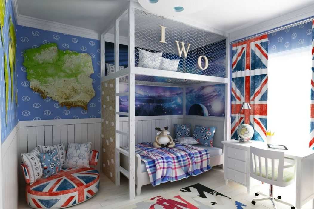 Красный, синий и оттенки белого часто используют для создания тематических интерьеров (особенно популярно такое сочетание для детской). Например, сочетание белого, лазурного и терракотового – это классика морского или пиратского стиля. Если оттенок синего будет напоминать ночное небо, то можно создать «космический» интерьер. Наконец, вспомните про английский флаг, который состоит именно из этих двух цветов. Поэтому современный интерьер на национальную британскую тематику базируется на сине-красном сочетании, как показано на фото, ниже.
