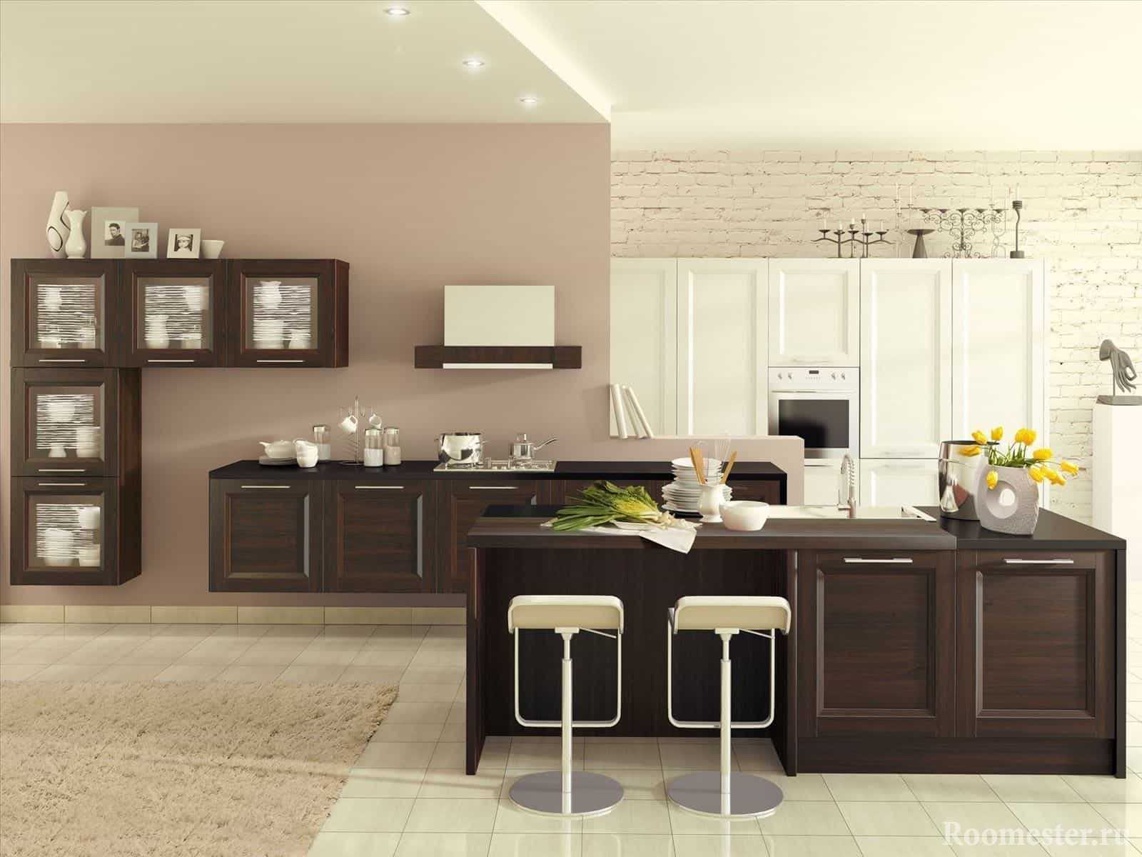 Можно смело говорить о том, что кухни коричневого оттенка могут быть использованы как в малогабаритных квартирах, так и в просторных загородных домах
