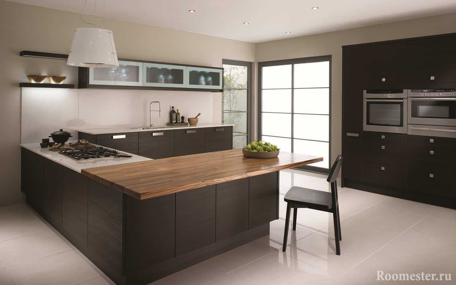 Чтобы кухня не выглядела мрачной, гарнитур дизайнеры советуют устанавливать на более освещенной стороне. Естественный солнечный свет позволит создать уютную атмосферу в помещении. При правильной организации пространства темная мебель не будет казаться слишком громоздкой и тяжелой.