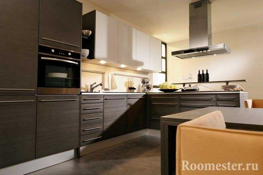 Использовать цвет венге можно и при оформлении кухни в стиле модерн. Такой дизайн характеризуется строгими формами, отсутствием излишней мебели. Все строго, функционально и гармонично. Технику предпочтительнее установить встроенную. Цвета на такой кухне должны идеально сочетаться друг с другом. Хорошим вариантом будет дуэт цвета венге и бежевого.