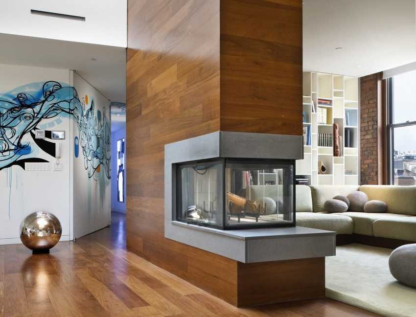 Для отделки колонны в центре гостиной использован ламинат