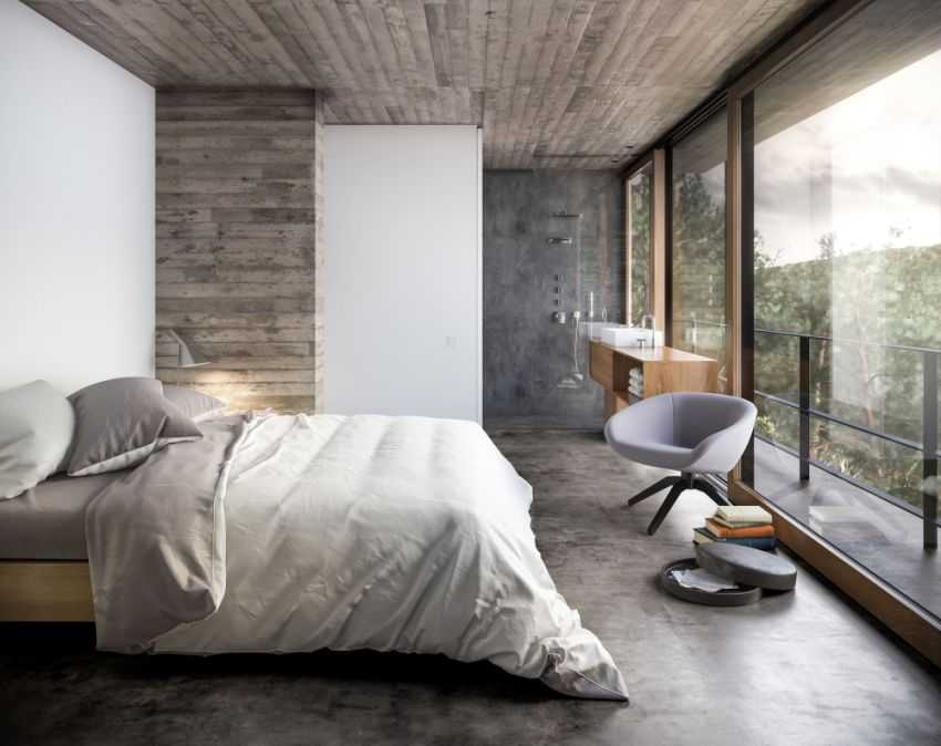 Ламинатом контрастно оформлен выступ в спальне