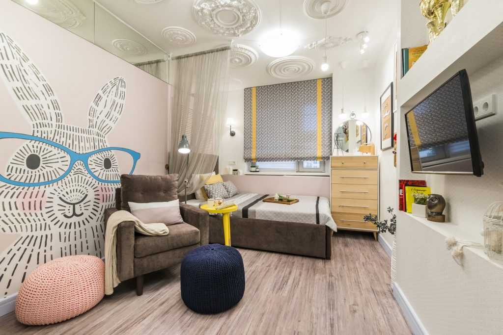 - для создания органичной обстановки, на окна вешают занавески, поддерживающие настроение и характер комнаты. Для дизайна в стиле кантри подойдут светлые шторы с клеткой или полоской. Мягкий деревенский интерьер в стиле прованс украсят бежевые, розовые шторы с некрупными цветочными узорами. Для подростковой комнаты, оформленной в современном стиле, можно подобрать шторы с модными принтами.