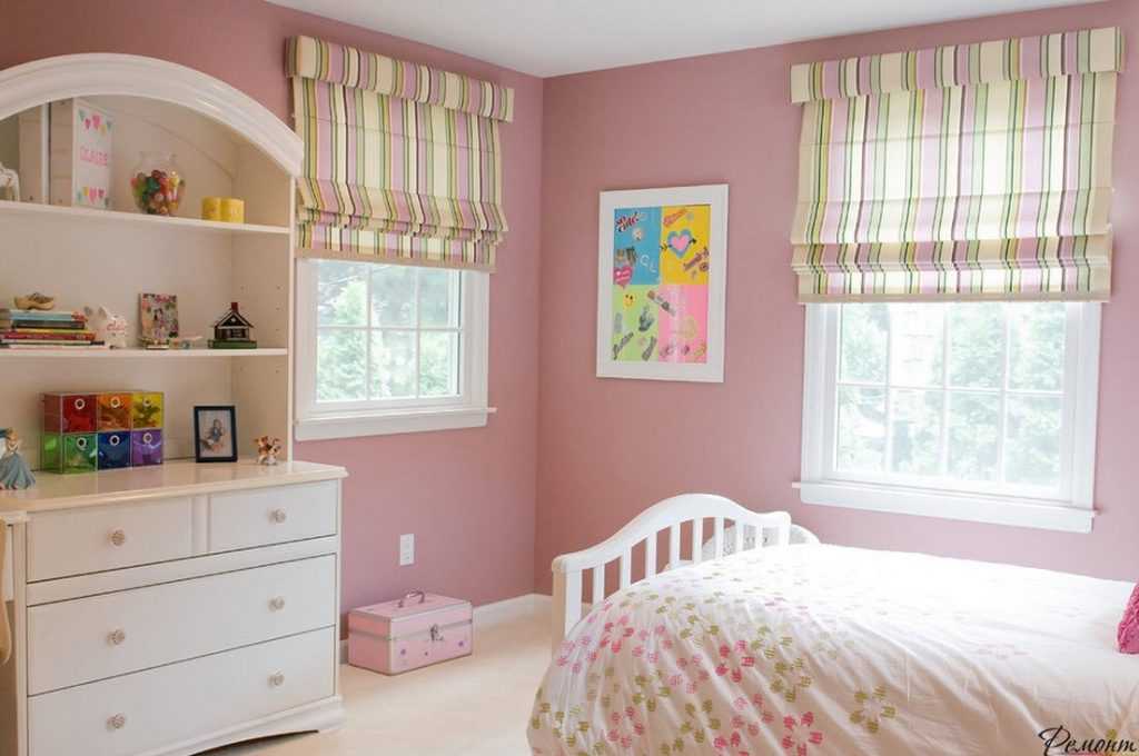Если в комнате преобладает розовый цвет, шторы лучше брать однотонные пастельных оттенков. Прекрасное сочетание будет однотонной римской шторки и яркой занавески.