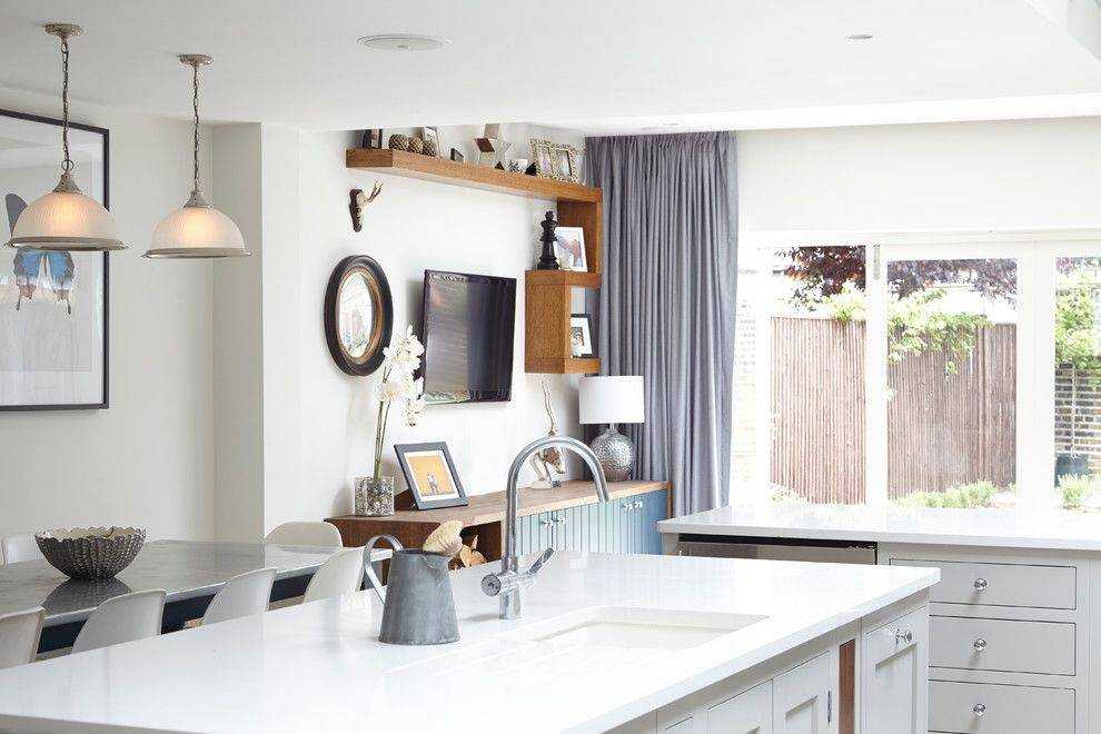 Убеждение, что белую кухонную мебель сложно мыть, не совсем верно. Светлый кухонный гарнитур требует к себе не больше внимания, чем шкафы других оттенков: наоборот, грязь на белом фоне лучше видно и вы сможете оперативно ее убрать, не давая засохнуть. Оттенок стен в основном зависит от количества естественного света, который попадает из окна: чем больше света, тем более темный оттенок можно взять. Рассмотрите вариант, когда для окраски потолка используется такой же цвет, что и на стенах: вы избавитесь от видимой границы потолка и визуально приподнимете его.