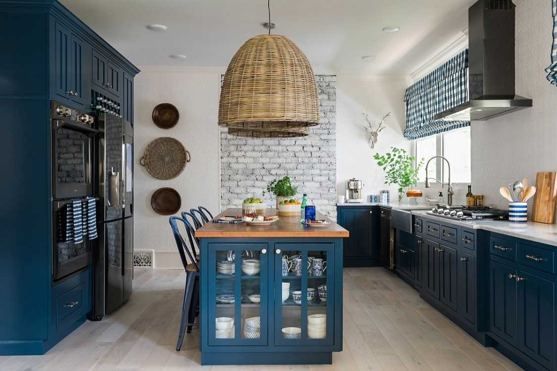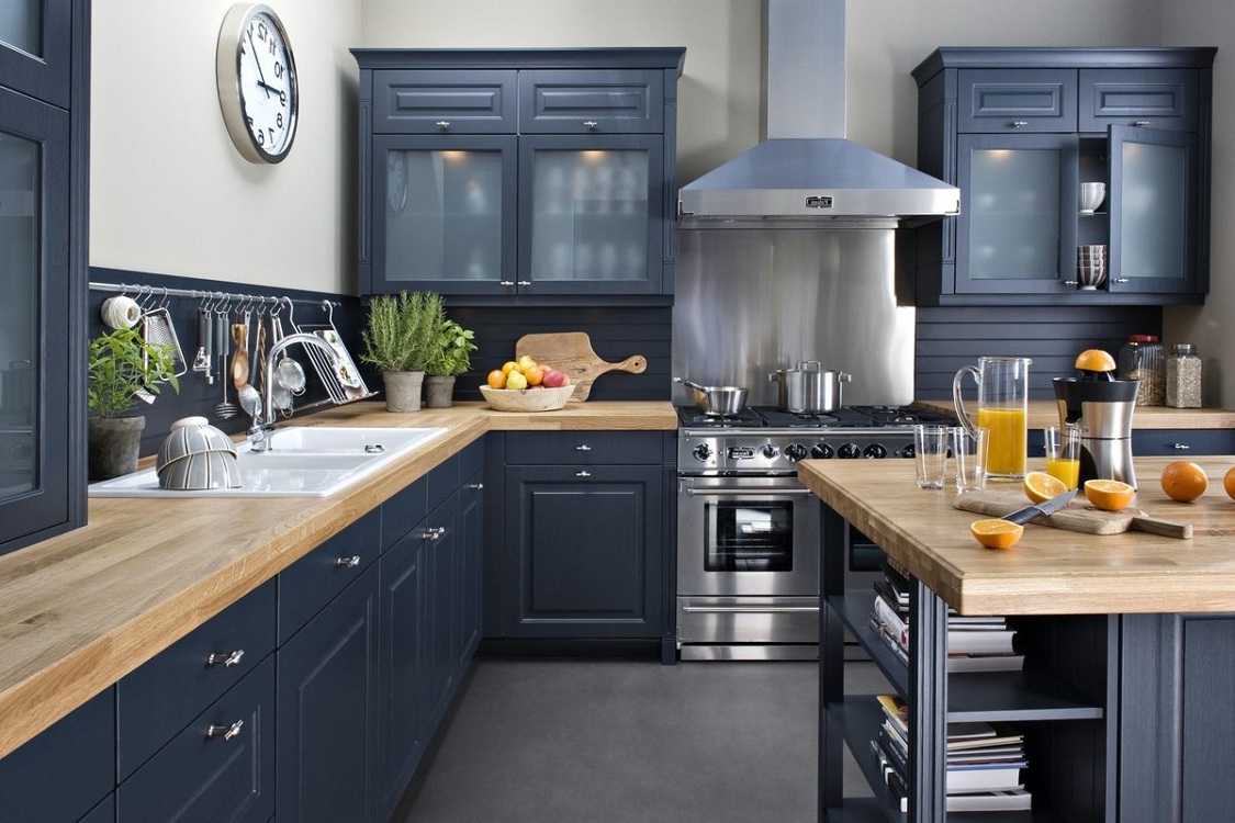 - Синий кухонный гарнитур + деревянную столешницу и деревянную мебель
