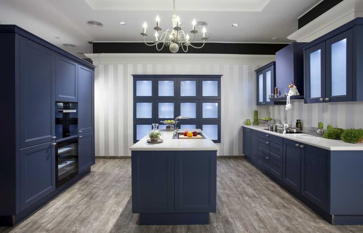 Кухня в бело-синих тонах в стиле арт-деко довольно функциональна и практична, а также требует дорогого оформления. Для дизайна применяют природный камень, дерево и кожу. Если именно на таком варианте кухни вы остановились, то вам следует приготовиться потратить на это кругленькую сумму. У многих дизайнеров есть варианты кухонной мебели в этом стиле, выполненную в синих тонах.