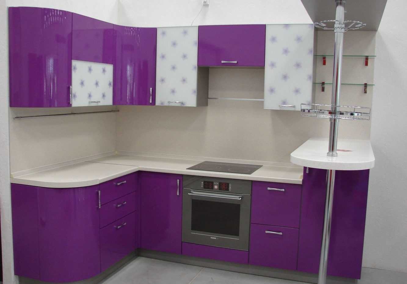 Сиреневые кухни угловые можно использовать даже в маленьком помещении, но оттенок следует выбрать светлый. Насыщенный темный цвет уместен только в случае большого пространства, и форма может быть совершенно причудливой, от стандартных Г-образных, до оформленных как остров.
