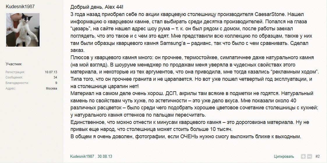 Для полной картины следует также описать плюсы и минусы рабочих поверхностей из кварцевого агломерата. Сразу скажем, что по эксплуатационным характеристикам искусственный камень из кварцевой крошки, по нашему мнению, на голову выше акрила.
