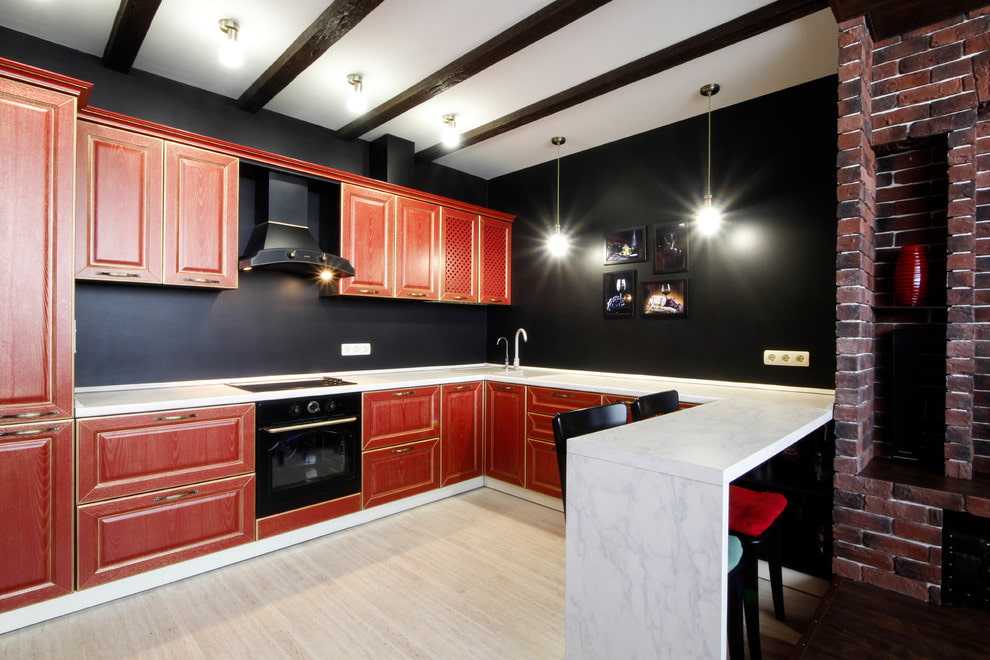 Если предусмотрены предметы мебели ярких оттенков, то стены окрашиваются в контрастный тон. Если кухонные модули имеют естественную расцветку в классической интерпретации, подбираются похожие более светлые или темные оттенки. Но для создания современного интерьера стены можно окрасить в яркие цвета: красные, оранжевые или индиго.