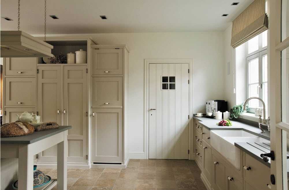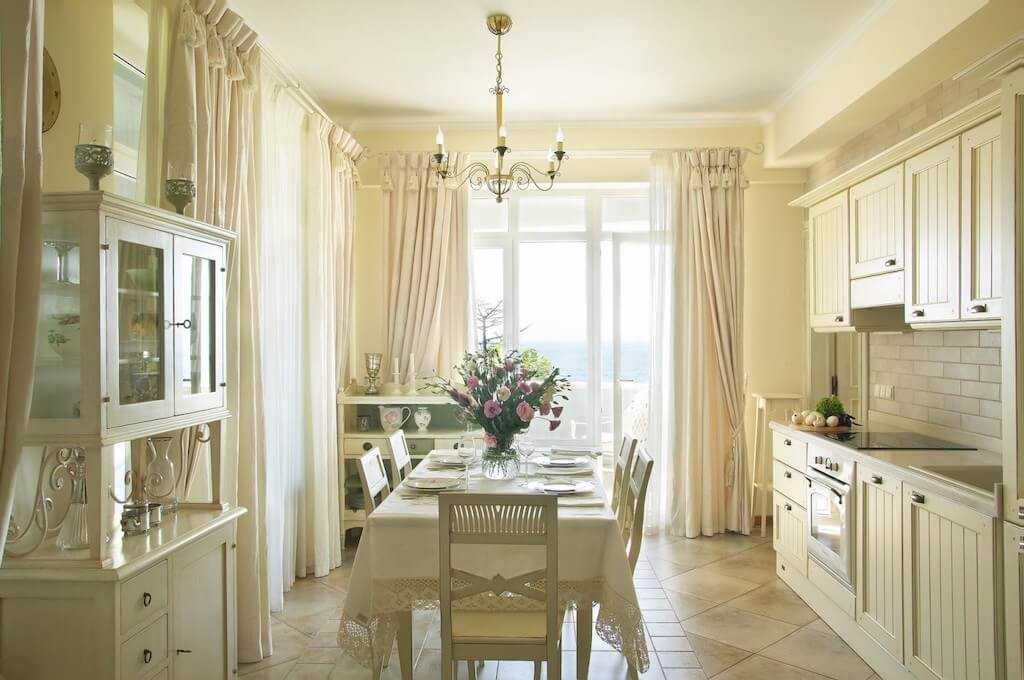 Оптимально выдерживать нейтральный тон во всем: шторы, скатерть, занавески на полках – все это лучше выполнить из льна, в тот же цвет следует окрасить стены. Или же для стен выбирают фисташковый оттенок, тогда гарнитур будет нейтрально молочным, кремовым или бежевым.