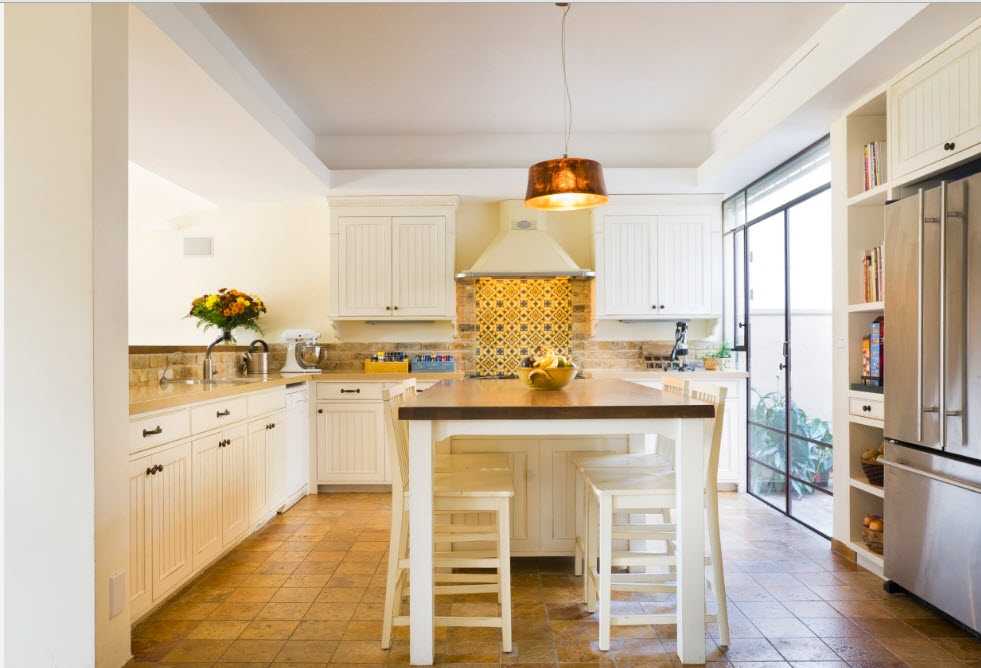 Здесь кухонный гарнитур может быть выполнен в достаточно ярко-изумрудном и даже лимонном цвете. Оформление остальной части помещения использует чаще всего светлые материалы. Но обеденные стулья и стол предпочтительны в натуральном древесном оттенке.