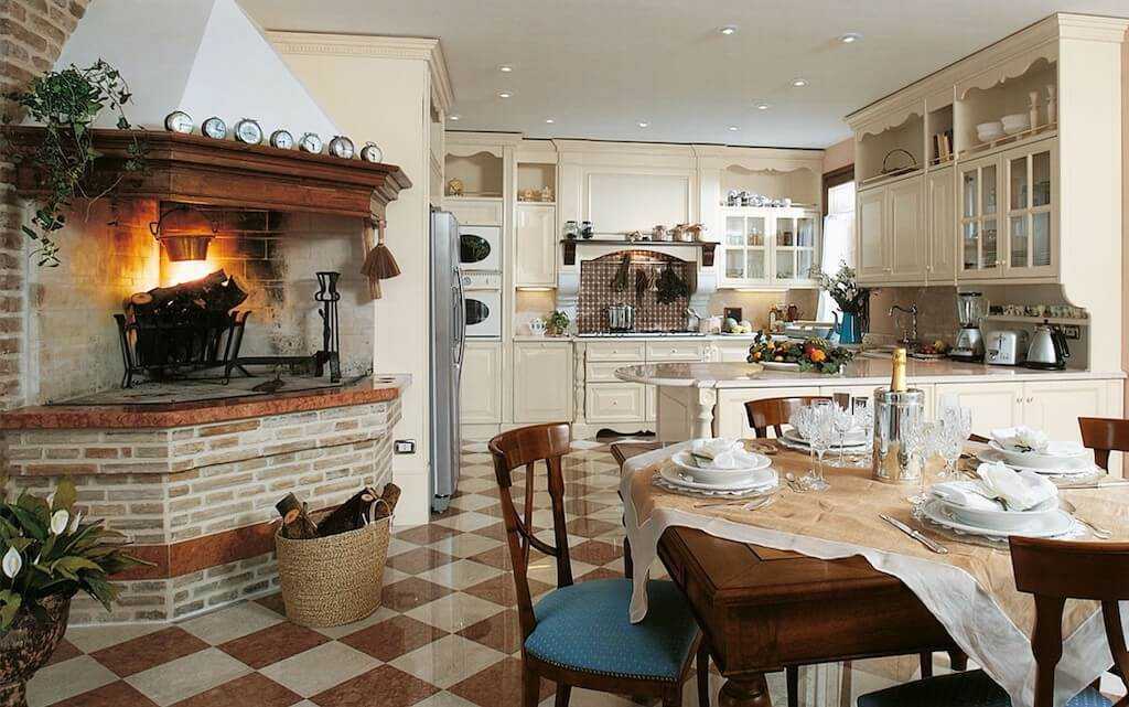 Сегодня Кантри стилистика в мебели для кухни передается с помощью филенчатых фасадов, элементов резьбы по дереву, вставок из стекла и открытых полок. Для эффекта состаренности мебели используют патинирование и винтажную фурнитуру. Небольшие потертости и даже маленькие трещины являются плюсом для поддержания деревенского стиля. Через белый цвет то и дело проступают серо-голубые потертости, зелень медных ручек или розовые цветочки на вставках белой керамики.