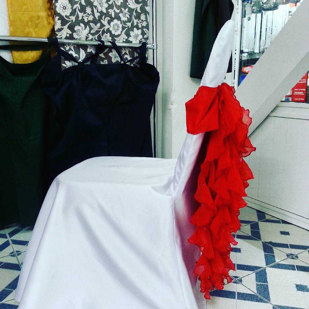 | Лайкра или бифлекс | Она отлично тянется и плотно облегает стулья, подчёркивая их строгую форму. Это самый лучший выбор для праздничного украшения. |