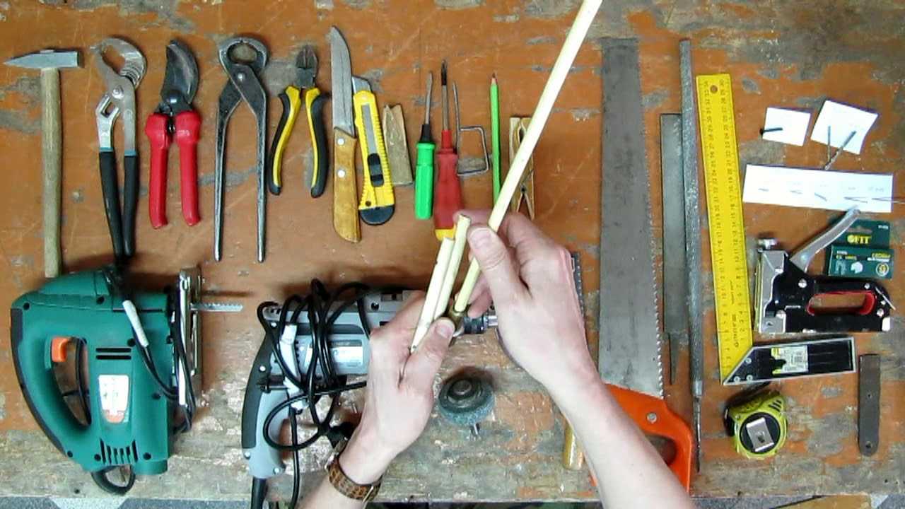 - плоскогубцы, шило, нож, шурупы, отвертка (с короткой ручкой), колунок, электродрель;