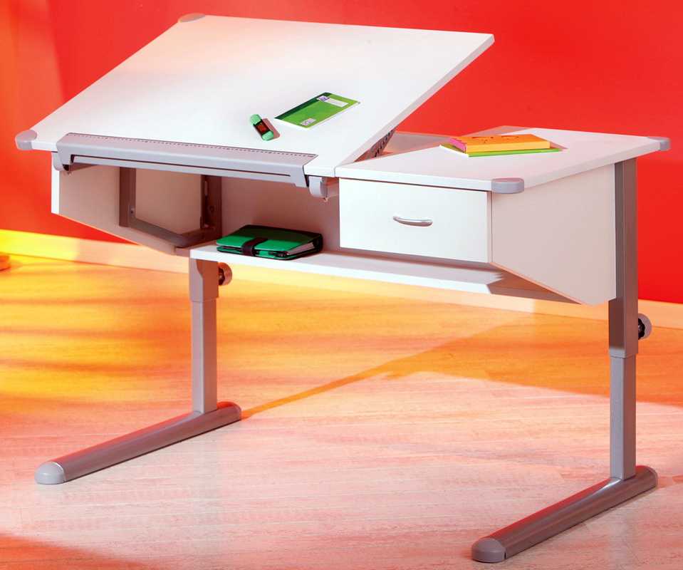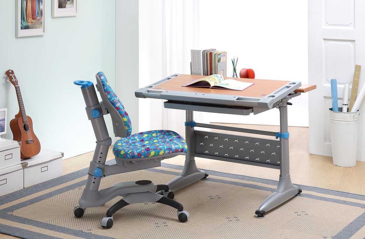 Для учеников начальных классов рекомендуется выбирать не обычный стол, а парту с наклонной столешницей. Она обеспечит правильное развитие осанки и формирование почерка. Если нет возможности приобрести низкий стол, соответствующий росту, можно компенсировать высоту регулируемым креслом. В этом случае необходима подставка под ноги.