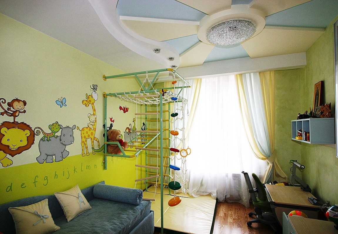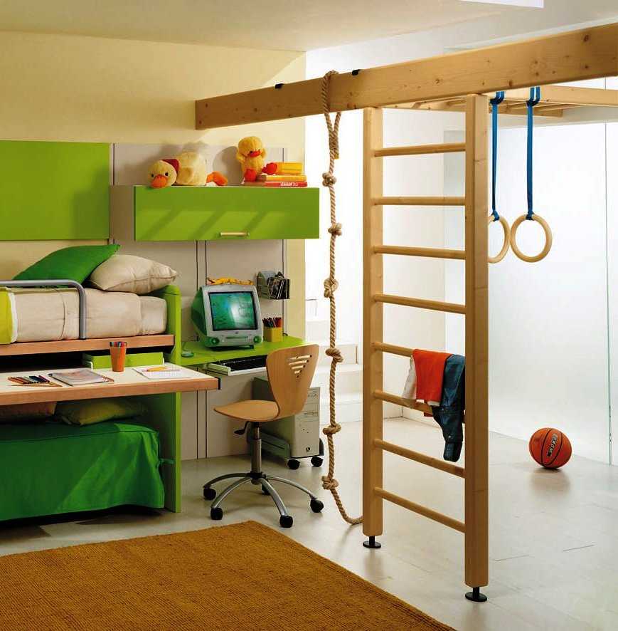 Наличие на стене перекладин для подтягивания, колец на потолке и груши для занятий боксом для ребенка обязательно. Если комната малогабаритная и места не много для установки спортивных тренажеров, минимального комплекта будет достаточно, выделите в детской зоне часть стены и потолка.