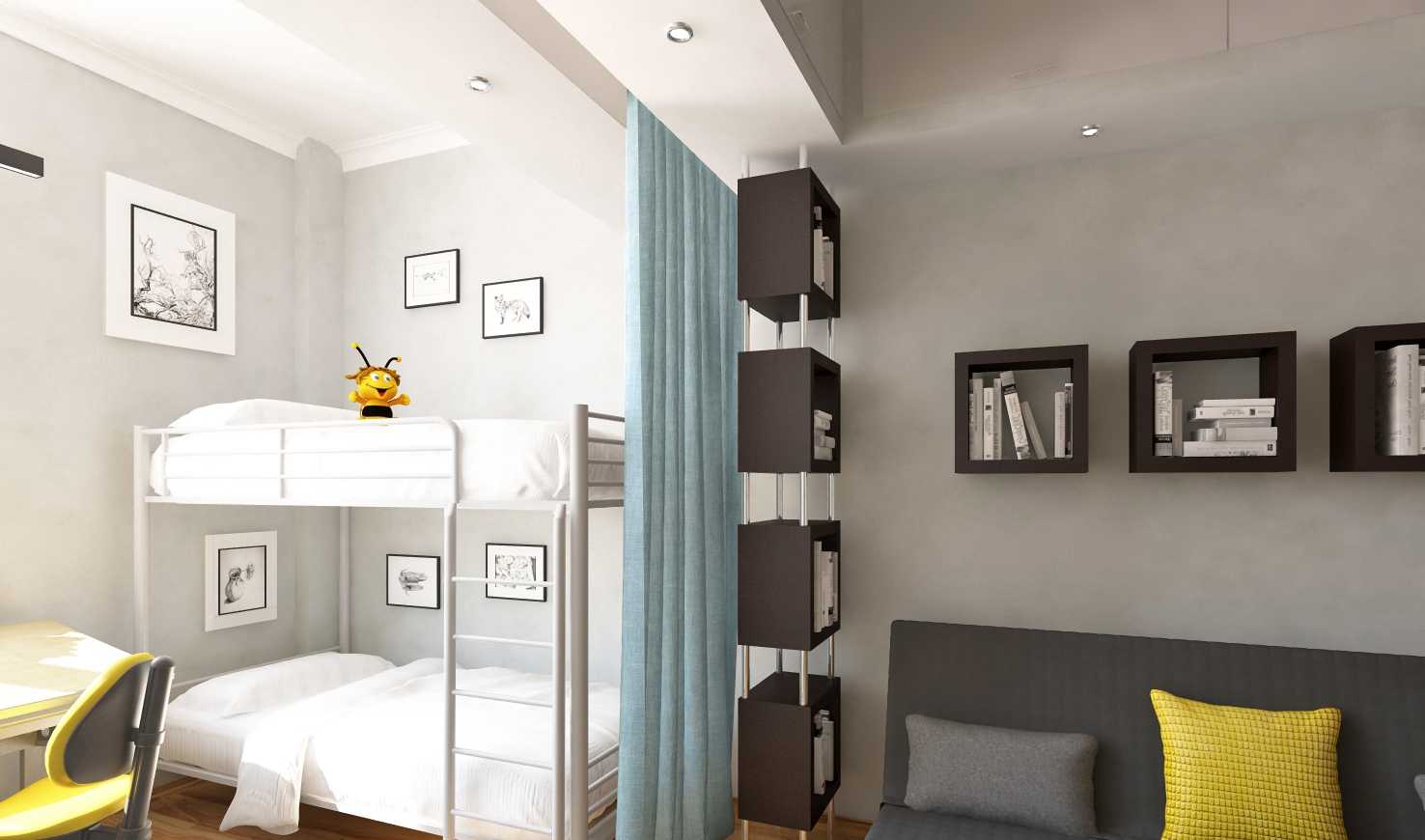 В однокомнатной квартире ребенок не всегда может претендовать на личную комнату. Поэтому родители проводят зонирование квартиры чтобы комфортно обустроить пространство для ребенка.