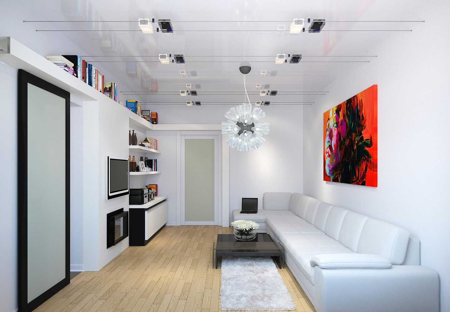 Дизайн интерьера маленькой гостиной прекрасно дополнит глянец на потолке