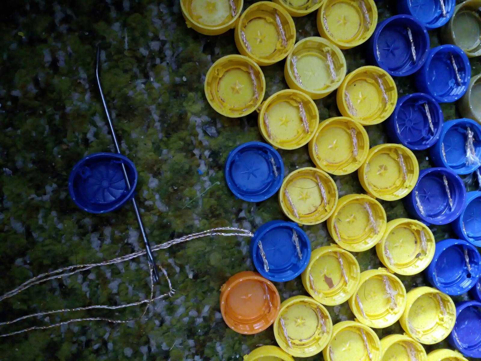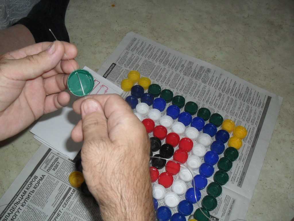 Каждый ряд крышек нужно брать по отдельности и продевать сквозь отверстия общую леску, нанизывая детали, как бусы. Если у вас толстая леска, никакой иглы вам не потребуется, кончик будет легко проходить через готовые дырочки