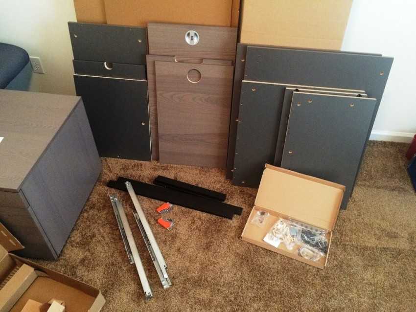 Рядом с собой нужно разложить все элементы мебели, освобожденные от пленки или пакетов, рассортированные по назначению, например: