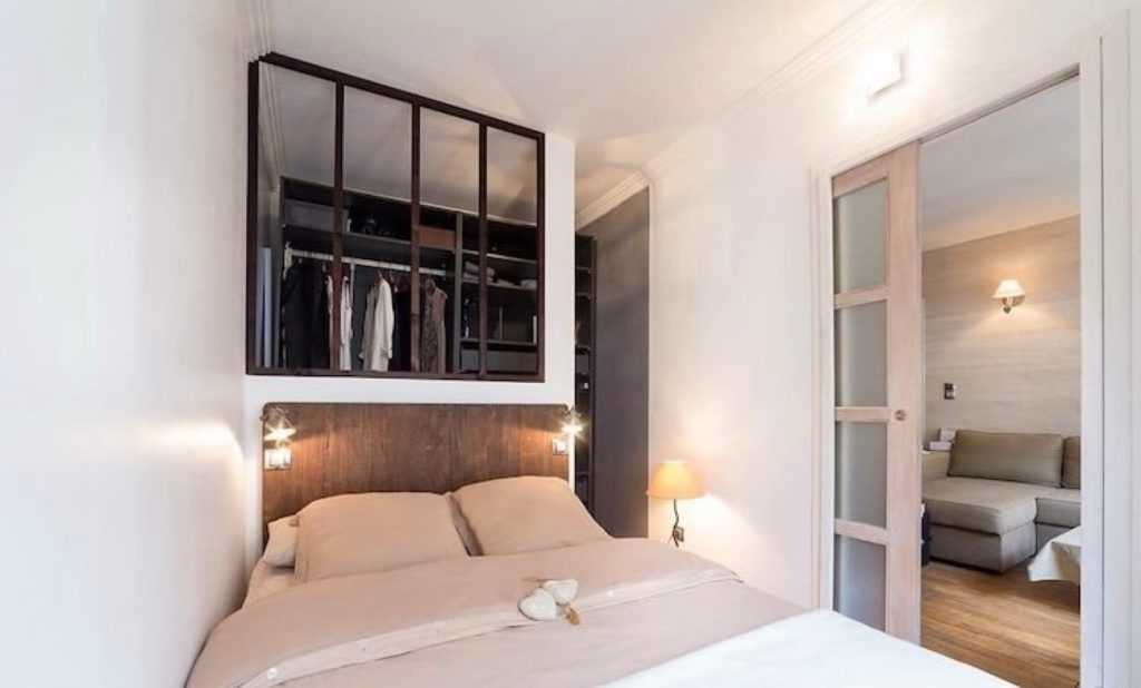 В крошечных комнатах редко встаёт вопрос о способе размещения постели. Можем лишь отметить, что дизайнеры нередко жертвуют одним проходом в пользу свободного метража. И этот подход оправдан.