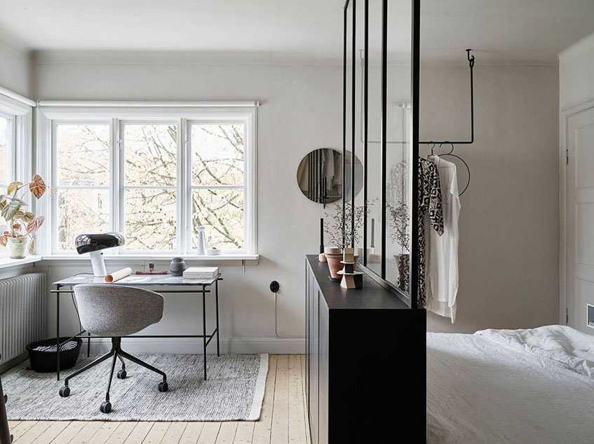 - Перегородка поможет отделить спальную зону от рабочей. Это будет как практически верное решение, так и психологически будет проще настроиться на работу.