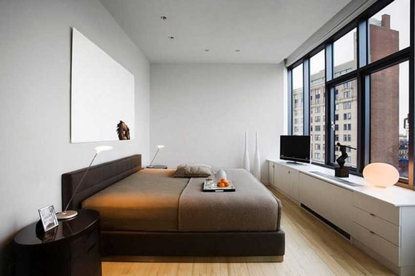 Подобный стиль идеален для небольшой спальной комнаты. Отсутствие декоративных изысков, монохромность, строгие формы и чёткие линии – все это характерно для минимализма.