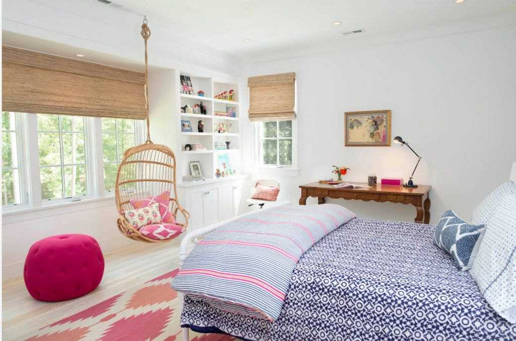 Среди дополнительных предметов обстановки может быть подвесное кресло, пуфы, напольные подушки или стулья для приема гостей. Широкий и низкий подоконник можно превратить в небольшой диван. Помимо этого, позволительно добавить шведскую стенку или другие тренажеры для активных и подвижных девочек. В центре комнаты можно постелить ковер из натуральных материалов, чтобы можно было лежать на полу. Напольное покрытие лучше тоже выбирать натуральное, из паркетной или ламинатной доски. Для детской стоит выбирать мебель из дерева или ДСП, чема не пластиковую. Низкокачественный пластик может быть токсичен.