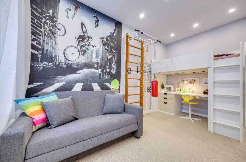 Мальчики больше любят строгую классику с применением каких-то необычных материалов, элементов декора. Идеи можно почерпнуть в интернете, либо придумать что-то свое. Можно, например, старый велосипед покрасить и повесить на стену в виде декора, заказать огромный стеллаж и хранить на полках коллекционные машинки, фигурки супергероев, ну или книги. Вариантов много.