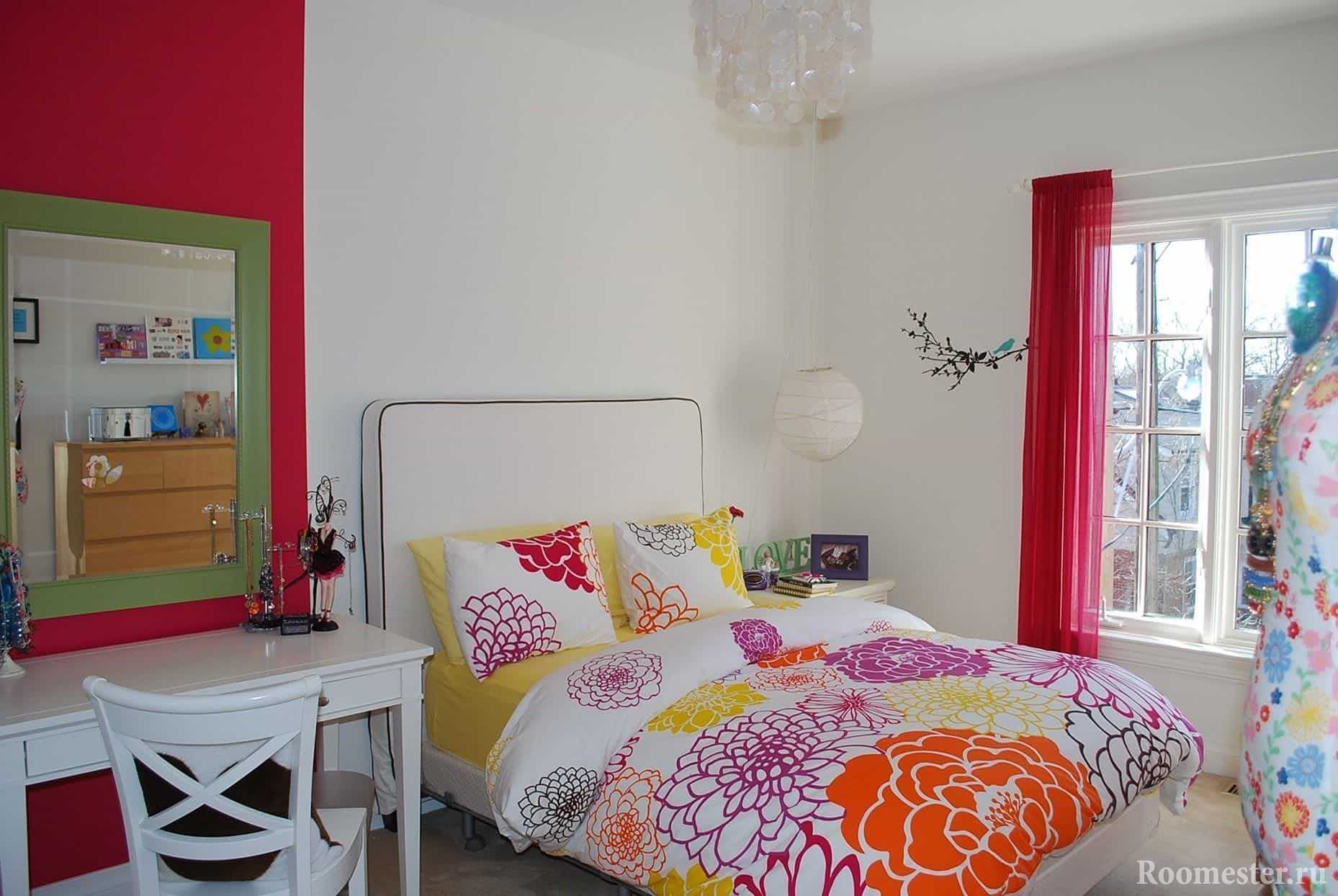 Голубой, серый, коричневый, красный и насыщенно-зелёный — контрастные цвета, которые будут идеально вписываться в интерьер девчачьей комнаты. Акцентирование яркими красками также пойдёт на пользу интерьеру.