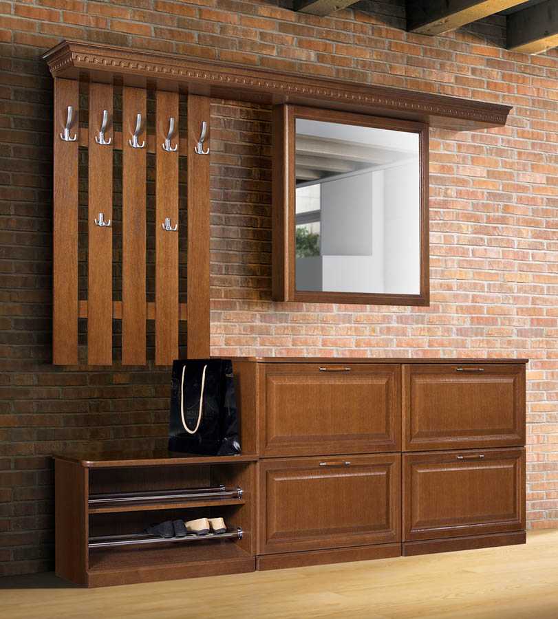 Классические прихожие в коридор выглядят респектабельно и элегантно. Мебель в классическом стиле выдержана в традициях прошлого. Ее линии чисты и изящны. Обязательно используется декор: фигурное обрамление дверных филенок, карнизы, элементы резьбы и т. п. Самые популярные цвета — белый (при этом резной декор может быть позолочен) либо цвет темного дерева. Фигурные мебельные ручки и крючки для одежды непременно должны быть «под старину». Для мягких элементов используется стеганая кожа или дорогой гобеленовый текстиль.