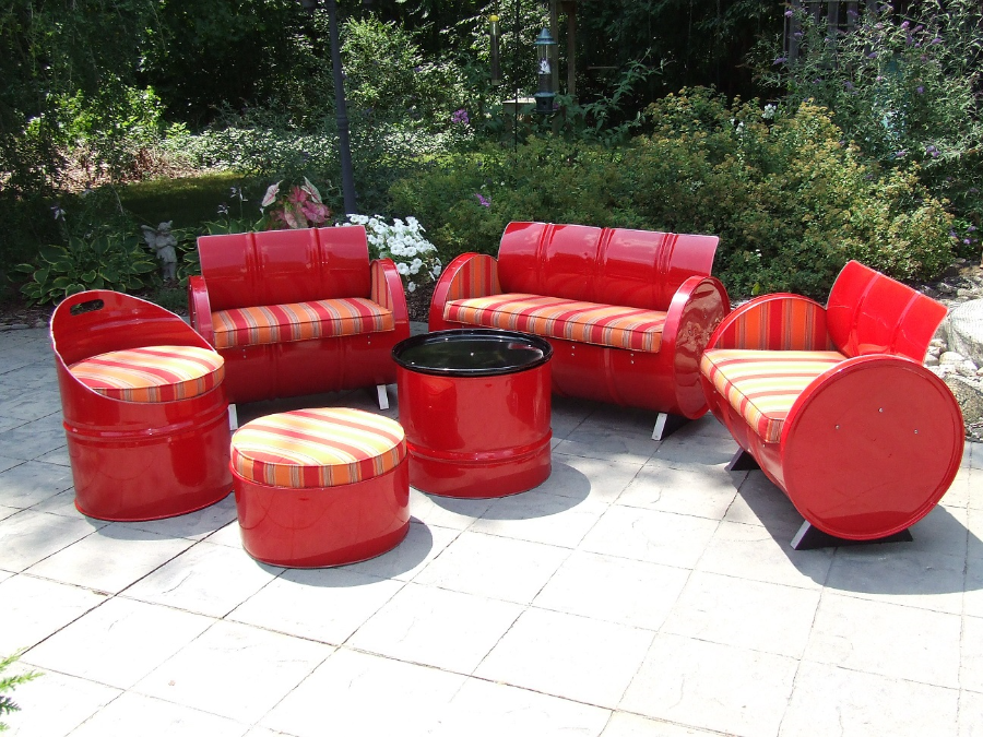 В огороде или на газоне устанавливают умывальники. Иногда материалом выступает металлическая бочка, причем вариант выглядит лучше с темным окрасом и матовой текстурой. По такому же принципу изготавливают столы с компактными столешницами и стулья с такими же, небольшими сиденьями. «Вишней на торте» станут разноцветные металлические бочки с вырезанными отверстиями для сидушек и спинками из полученных фрагментов. Причем изделия прекрасно впишутся и в замкнутую обстановку. Деревянные бочки используют намного чаще. Из них вырезают детали для крупной и мелкой мебели. Винные бочки становятся частью стульев, диванов, столов. Вазоны для больших растений, переносной холодильник или резервуар для льда — также отличные варианты для теплого времени года. Даже такое непримечательное приспособление, как мусорный бак, тоже иногда делают из деревянной бочки.