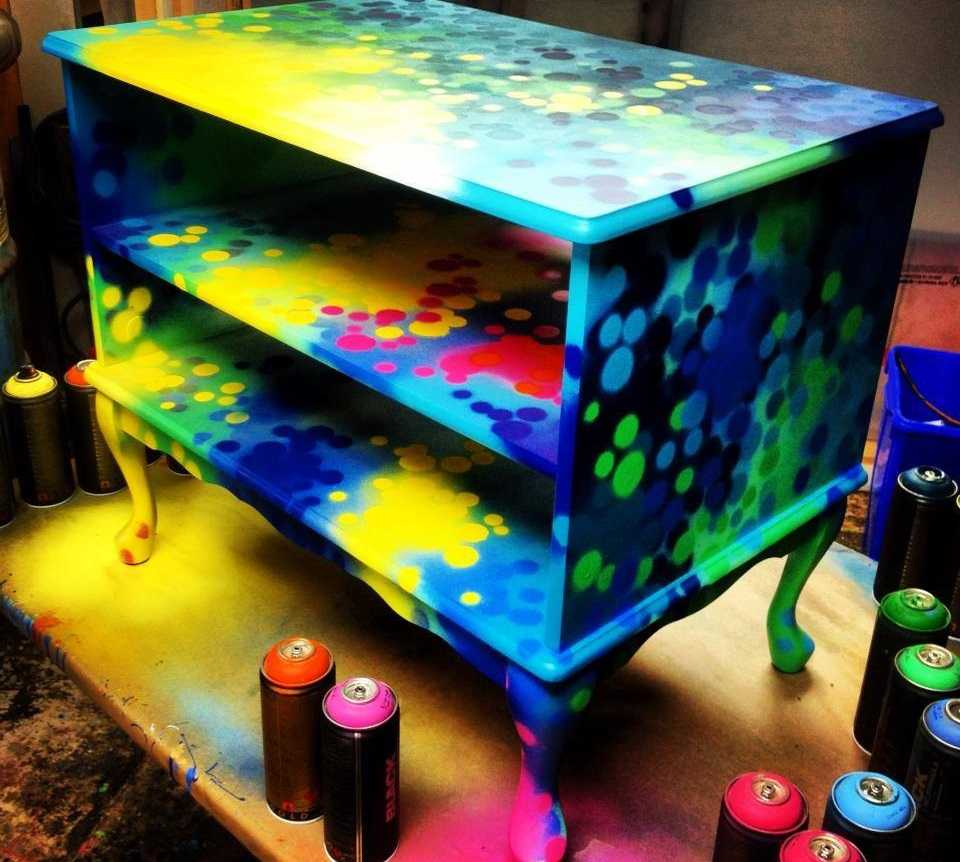 Если есть желание иметь расписанную яркими красками мебель, но нет таланта художника, то на помощь придут трафареты, с использованием которых делаются рисунки. Их можно купить в строительных магазинах или подготовить своими руками из картона. Также потребуется краска в баллончиках. Способ преображения прост и творчески интересен.