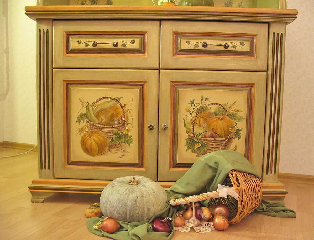 - овощи и фрукты — подойдут для росписи кухонной мебели.