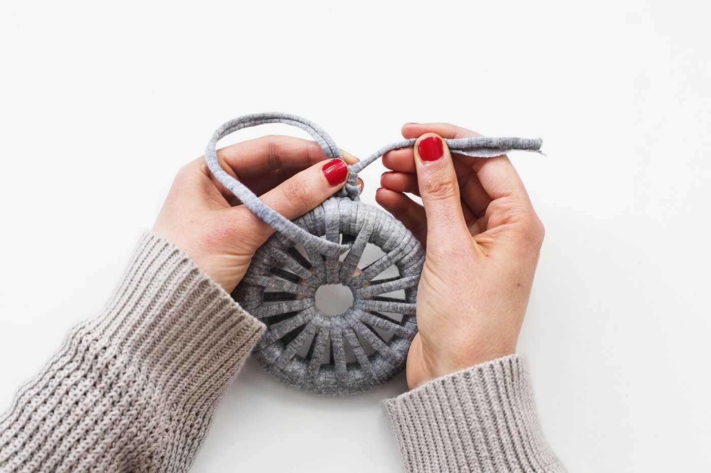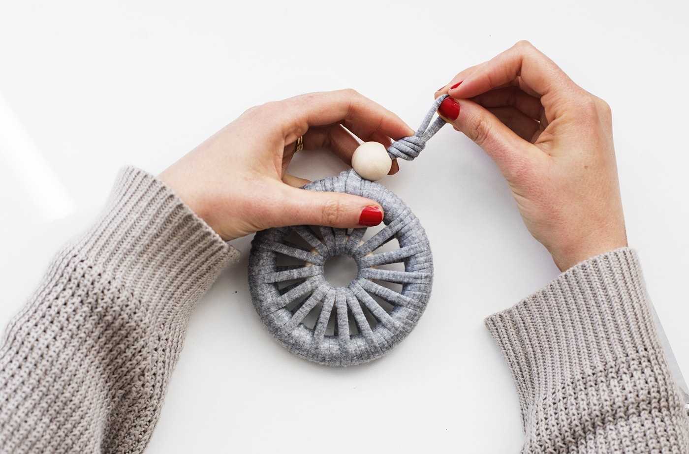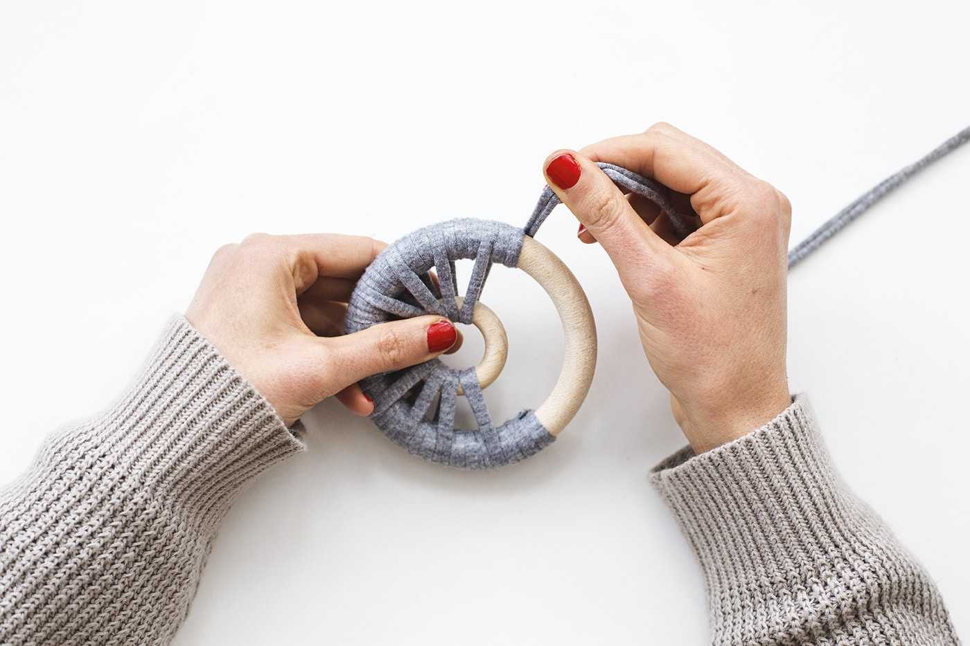 К большому деревянному кольцу с помощью двойного узла привязываем конец трикотажной веревки. Короткий хвостик, выходящий из него, обрезать не нужно.